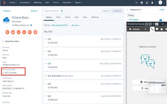 باستخدام أوكتافبايتس - هابسبوت النقر للاتصال ، يمكن للمستخدمين بسهولة بدء المكالمات الصادرة بالنقر فقط على زر الاتصال بجوار رقم هاتف الاتصال. يمر الامتداد بسلاسة رقم هاتف الاتصال إلى موصل CTI من أوكتافبايتس ، مما يتيح الاتصال الصادر بكفاءة وبدون متاعب.